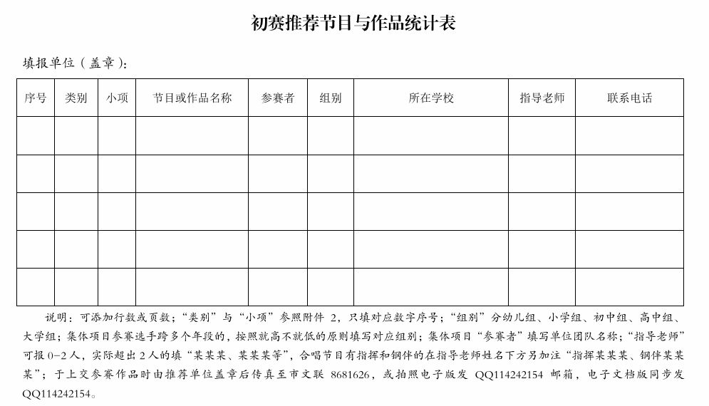 选拔赛:各县市区、各学校可以在本辖区、本单位举办选拔赛,遴选推荐优秀作品和节目参加全市初赛。